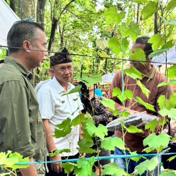 Pj Bupati Bekasi Dani Ramdan mendampingi Pj Gubernur Jawa Barat Bey Machmudin membuka acara Pasar Pasisian Leuweung yang berlangsung di Hutan Kota Eduforest, Kabupaten Bekasi, Minggu (26/5/2024).