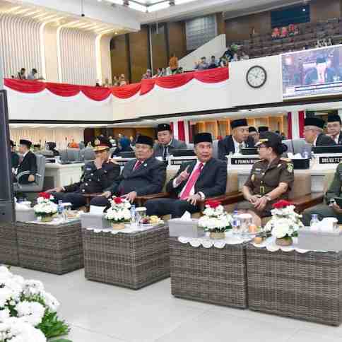 Penjabat Gubernur Jawa Barat Bey Machmudin bersama para kepala perangkat daerah dan anggota DPRD Jabar mendengarkan pidato kenegaraan Presiden RI dalam rangka HUT ke - 79 Republik Indonesia, di Gedung...