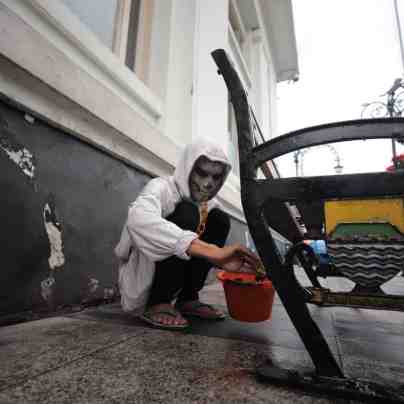Sejumlah relawan melakukan aksi kebersihan di kawasan Asia Africa Corner, dalam rangka memperingati Konferensi Asia Afrika (KAA) dan menyebarkan kesadaran mengenai 'Shine of Peace'.Tim Asia Africa Cor...