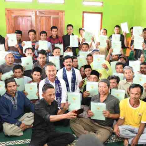 Penjabat Gubernur Jawa Barat Bey Machmudin mendampingi Menteri Agraria dan Tata Ruang/Kepala Badan Pertanahan Nasional Hadi Tjahjanto memberikan sertifikat hunian tetap (huntap) kepada warga yang berm...